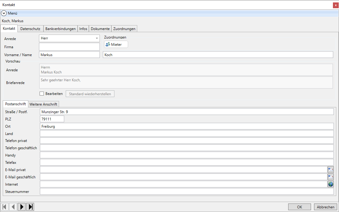 Erfassen Sie den Vor- und Nachnamen des Ansprechpartners. Anrede und Briefanrede werden um den Nachnamen ergänzt.