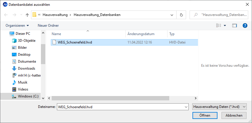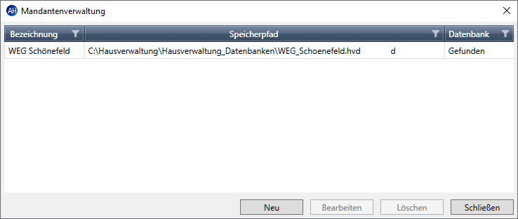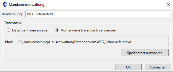 Wählen Sie die Datenbank aus, welche dem Mandanten mit der Bezeichnung WEG Schönefeld zugeordnet werden soll und bestätigen Sie mit Öffnen. Im Fenster Mandantenverwaltung wird der Verzeichnispfad im Feld Pfad angezeigt.