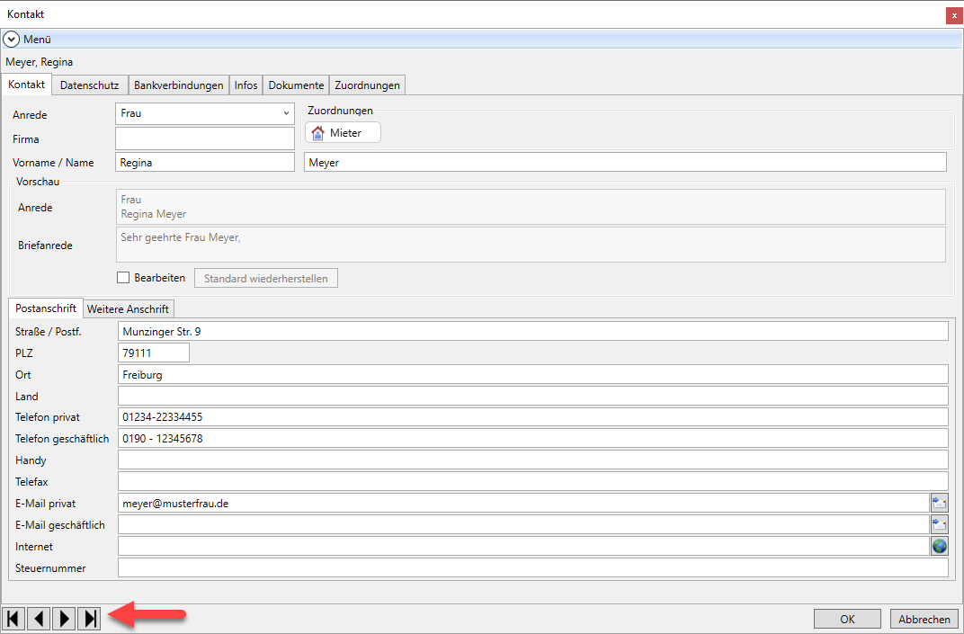 Haben Sie mehrere Kontakte eingegeben, können Sie sich über die Blätterfunktion im Kontaktfenster alle eingegebenen Kontakte im Kontaktfenster anzeigen lassen.