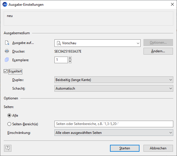 Klicken Sie auf Drucken, erscheint eine weitere Maske mit einigen Druckoptionen.