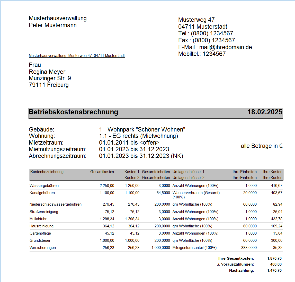 Hier werden entsprechend der Gesamteinheiten und eigenen Einheiten die Kosten angegeben, die vom Mieter zu tragen sind. Dieser Betrag wird wie folgt berechnet: Ihre Kosten = (Gesamtkosten : Gesamteinheiten) x Ihre Einheiten Nachdem in dieser Weise alle Umlagekonten aufgeführt wurden, wird am Ende der Mieterabrechnung die Gesamtsumme der eigenen Kosten ausgewiesen und mit den Heiz- und Nebenkostenvorauszahlungen verrechnet. Das Ergebnis der Abrechnung zeigt an, ob der Mieter eine Nachzahlung leisten muss oder einen Betrag zurückerstattet bekommt. Ist der Mieter vorsteuerabzugsberechtigt (siehe Mieter verwalten), wird auf die Gesamtkosten der für die Vermietung zutreffenden MwSt.-Satz, entsprechend des Grundsatzes Hauptlast trägt Nebenlast, angewandt. |
