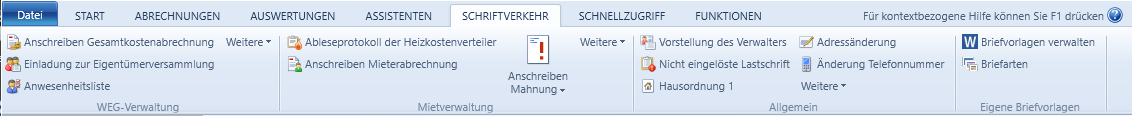 In der Registerkarte Schriftverkehr finden Sie als Gruppen zusammengefasst die einzelnen Rubriken der Textvorlagen.