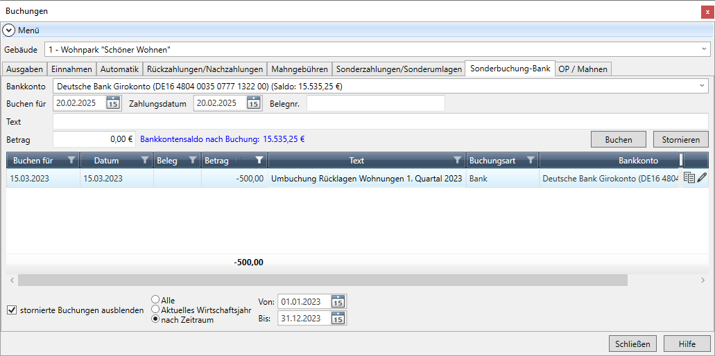 Wählen Sie im Register Sonderbuchung-Bank das Gebäude aus.