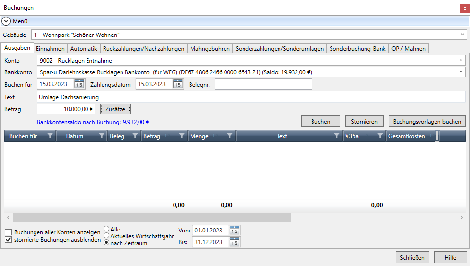 Wählen Sie im Feld Konto das Rücklagen-Umlagekonto, auf dem die Ausgabe verbucht werden muss, hier das Umlagekonto für Dachsanierung.