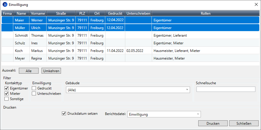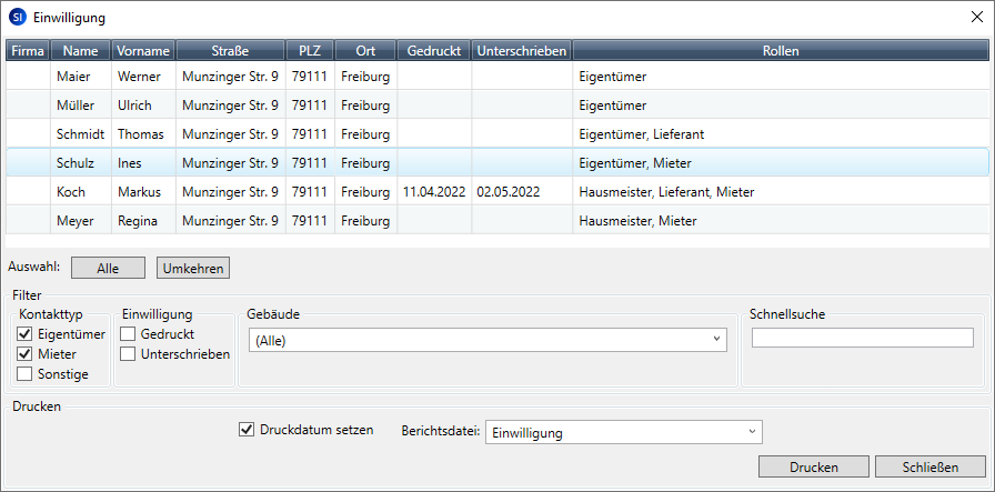 Im folgenden Beispiel zeigen wir Ihnen, wie Sie für alle Mieter eines Wohnhauses eine Einwilligungserklärung ausdrucken und den Vorgang im Kontakt dokumentieren.
