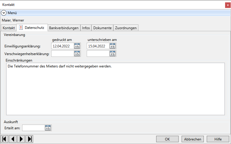 Wenn die Daten einer Person nur eingeschränkt genutzt werden dürfen (z.B. aufgrund der Vereinbarung, dass die Telefonnummer eines Mieters nicht weitergegeben werden darf), können Sie dies im Kontakt vermerken. Jeder Mitarbeiter erkennt damit sofort, wo Vorsicht geboten ist, um nicht gegen die Bestimmungen zu verstoßen.
