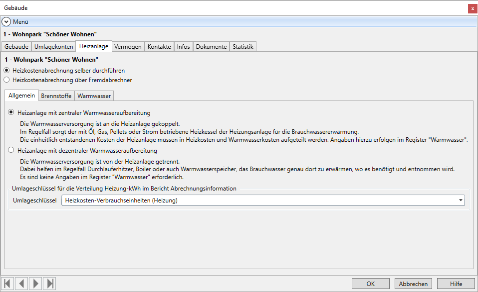 Alle Angaben zur Heizanlage und zur Aufteilung der Brennstoffkosten in Heiz- und Warmwasserkosten erfolgen mit SmartImmo 2026 jetzt zentral im Gebäude. Es sind keine Angaben mehr in den Umlagekonten erforderlich.