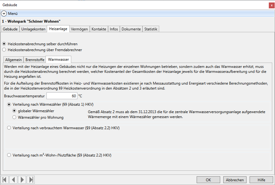 Im Register Warmwasser geben Sie an, nach welchen Kriterien bei verbundenen Heizanlagen die Aufteilung der Brennstoffkosten in Heiz- und Warmwasserkosten erfolgt.