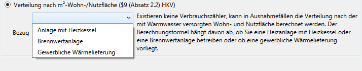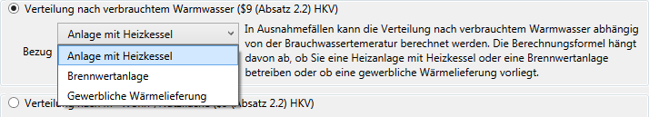 Wählen Sie im Feld Bezug den Eintrag Anlage mit Heizkessel, erfolgt die Anteilsberechnung der Gesamtwarmwasserkosten gemäß folgender Formel:
