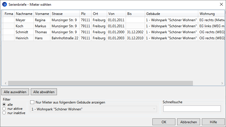 Das Fenster mit den möglichen Empfängern wird angezeigt. Es werden nur solche Kontakte angezeigt, die dem Empfängerkreis der Briefvorlage entsprechen, im Beispiel sind dies Mieter.