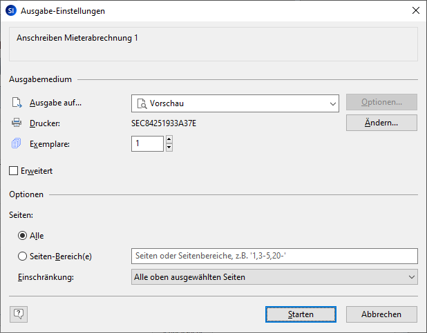 Bei Briefvorlagen, die mit List & Label erstellt wurden, öffnet sich das Fenster Ausgabe-Einstellungen.
