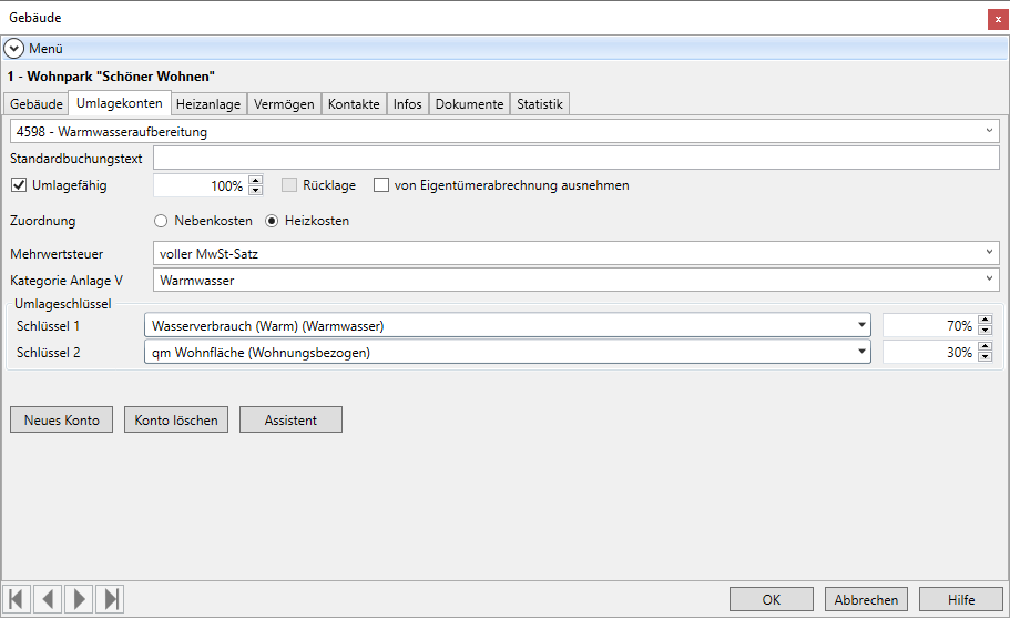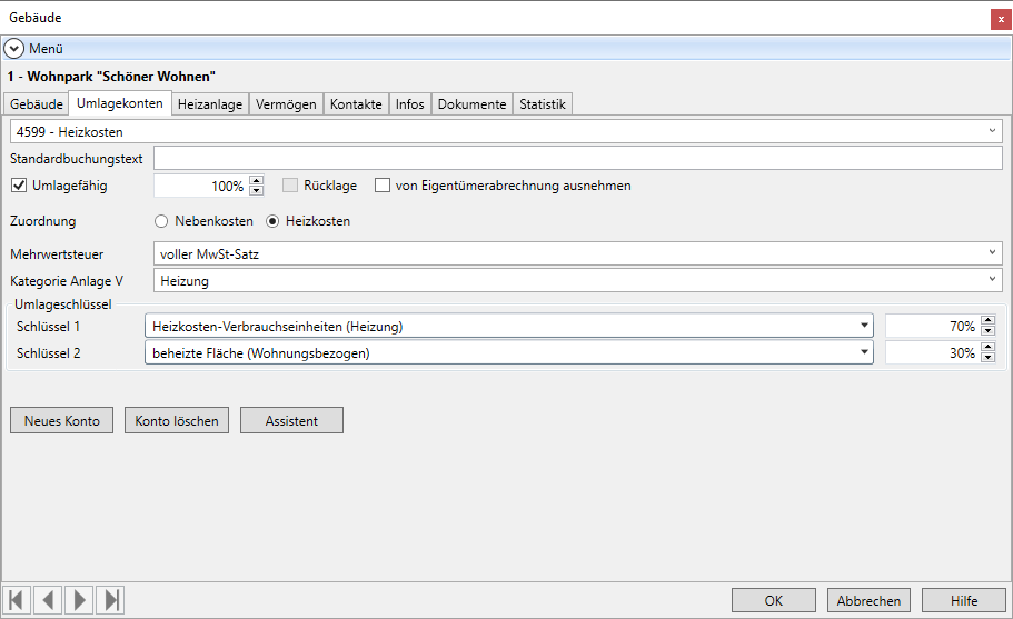 Bei der Definition der Umlagekonten gibt es einige Besonderheiten, sobald Sie ein Konto bearbeiten, welches mit den Heiz- und Warmwasserkosten zu tun hat.