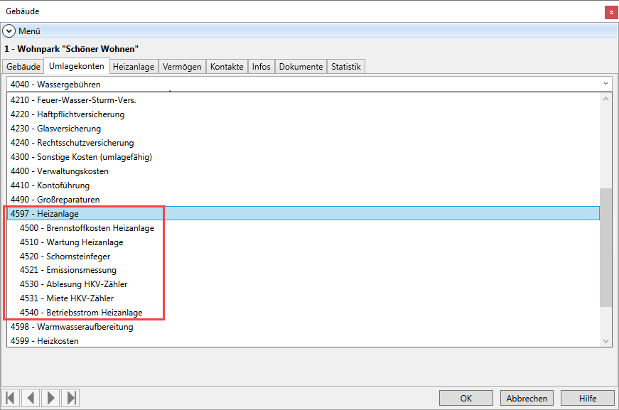 Unterkonten der Heizanlage erkennen Sie in der Konto-Auswahlliste daran, dass sie eingerückt direkt unter dem Konto 4597 Heizanlage aufgelistet werden.