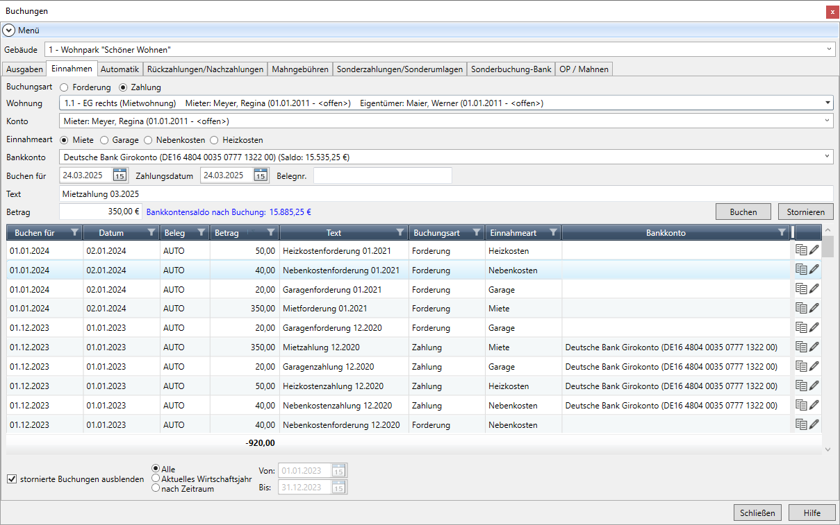 Die folgende Abbildung zeigt das Einnahmen-Register der Buchungsverwaltung mit ausgewählten Objektdaten und einem zugehörigen Personenkonto.