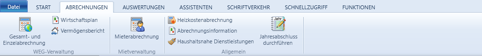 Die Registerkarte ist in die Befehlsgruppen WEG-Verwaltung, Mietverwaltung und Allgemein untergliedert.