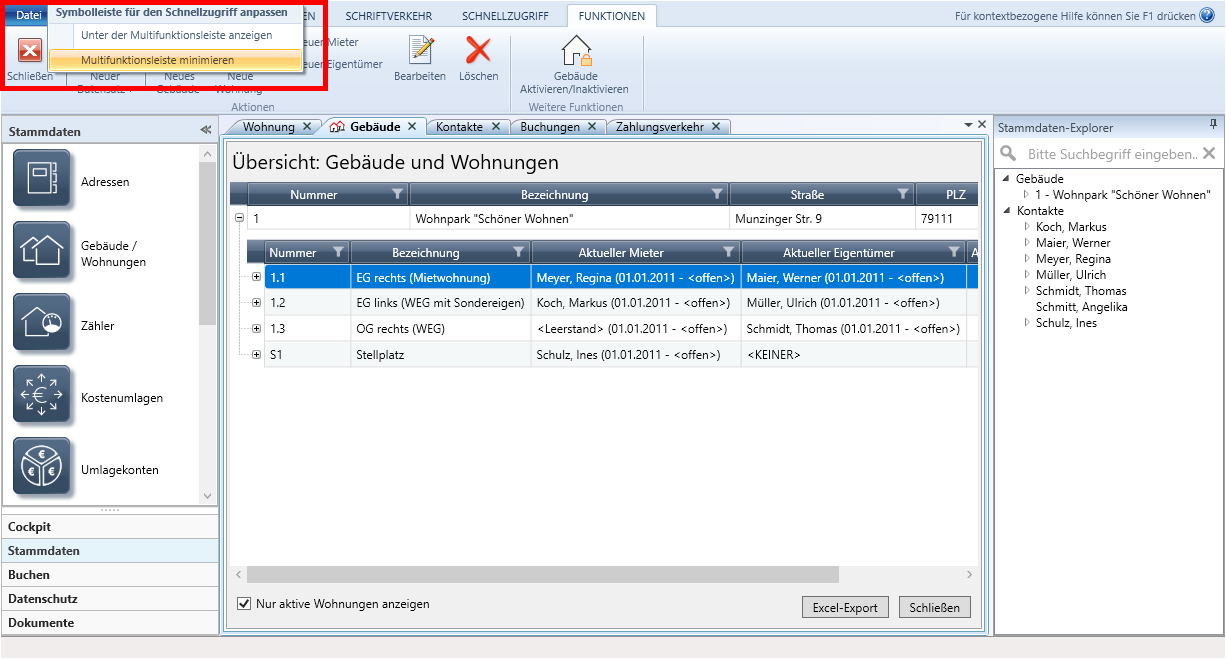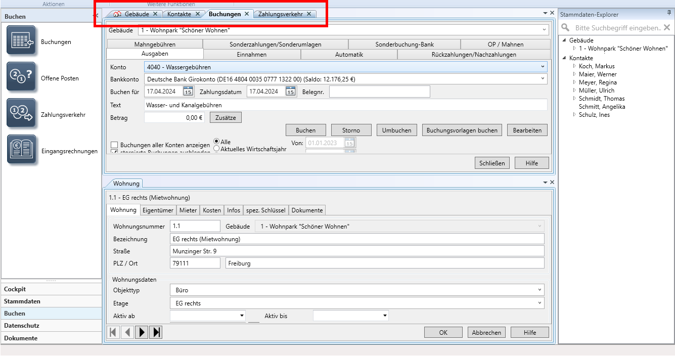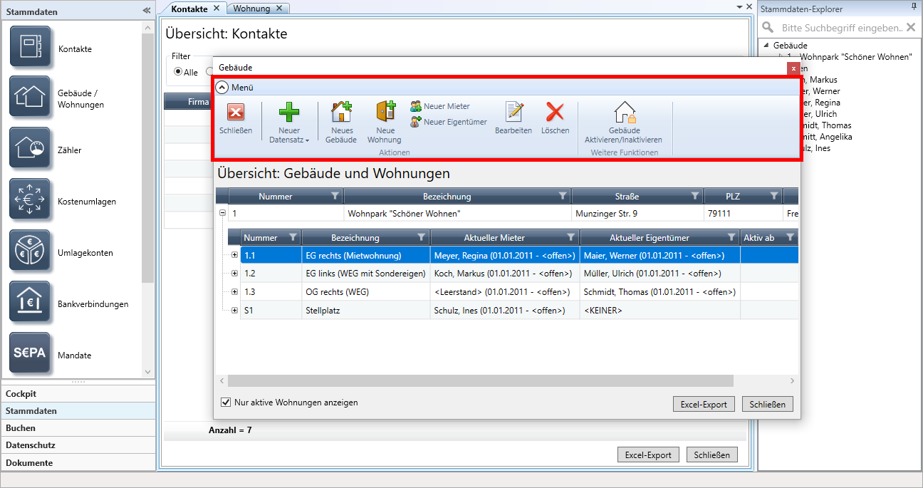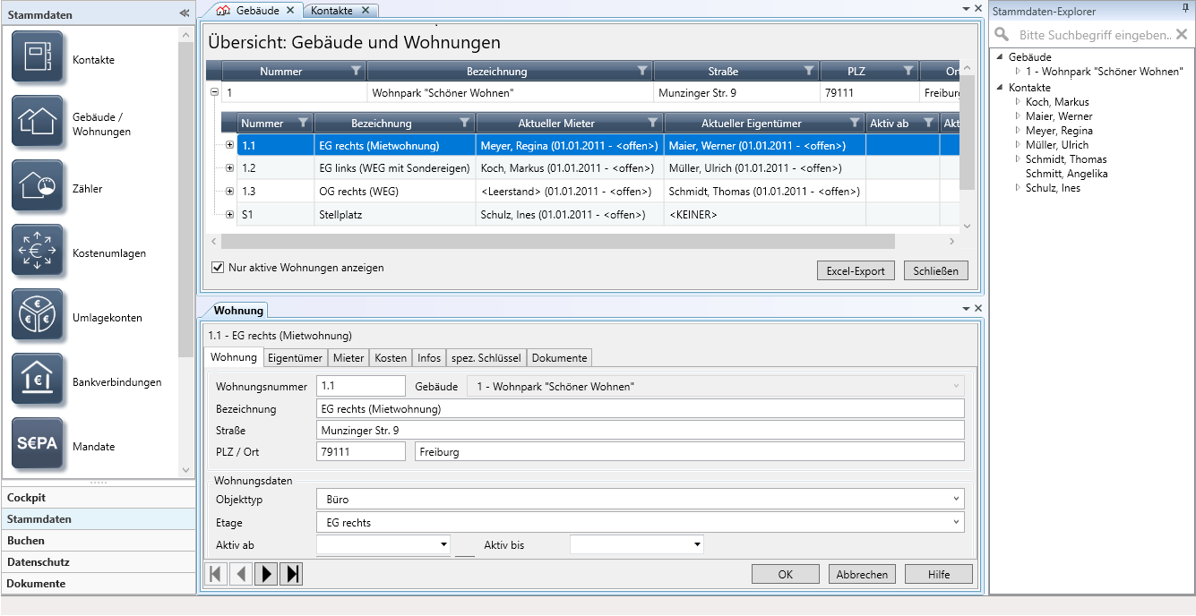 Im Beispiel ordnen wir das Wohnungsfenster unterhalb des Gebäudefensters an. Sie können jetzt in der Liste der Wohnungen navigieren und sich in der unteren Liste die jeweiligen Wohnungsstammdaten anzeigen lassen.