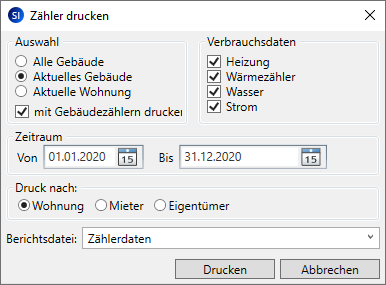 Sie können die Verbrauchsinformationen sämtlicher Gebäude drucken oder den Ausdruck auf das aktuell in der Zählerverwaltung auswählte Gebäude bzw. die ausgewählte Wohnung einschränken. |