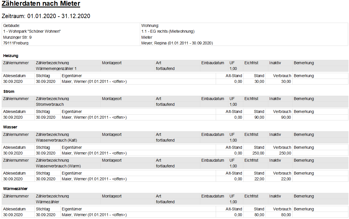 Mit der Option Druck nach Eigentümer bzw. Druck nach Mieter werden die Verbrauchsdaten nutzerbezogen nach Zählertyp und Verbrauchszähler zusammengestellt. Im Falle eines Mieter- bzw. Eigentümerwechsels werden für jeden Nutzer getrennt die Verbrauchsinformationen aufgeführt.