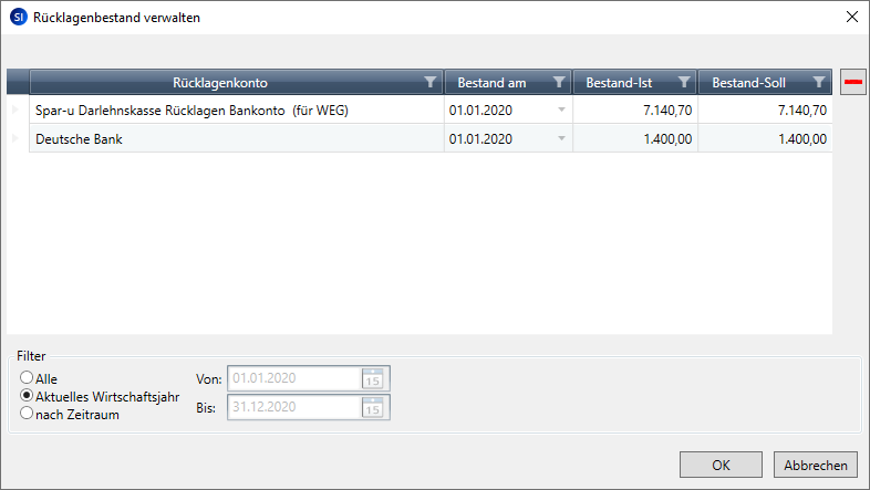 Wenn für ein Gebäude noch keine Eigentümerabrechnung erstellt wurde, enthält das Fenster keine Werte. Mit dem Erstellen der ersten Eigentümerabrechnung wird das Fenster mit Werten gefüllt. Der Anfangsbestand berechnet sich hierbei für jedes Rücklagenkonto nach dem Miteigentumsanteil in der Wohnung. Grundlage für die Berechnung ist der Bankkontostand der Rücklage zum Tag vor Beginn des aktiven Abrechnungszeitraums.