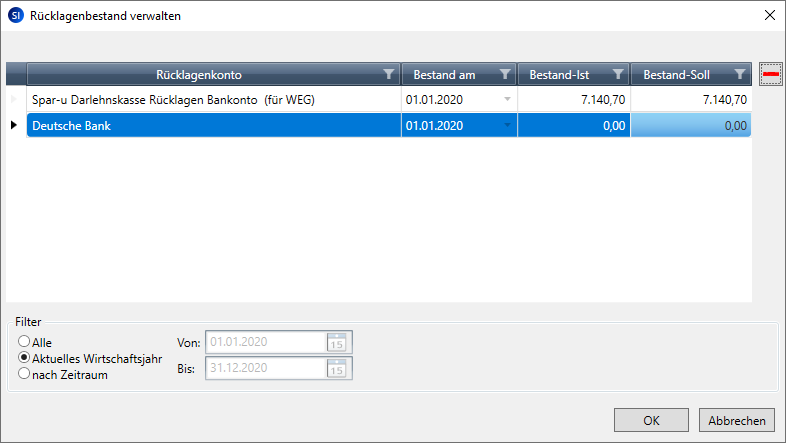 Wenn Sie anhand der Liste also erkennen, dass ein Anfangsbestand für ein Rücklagenkonto ausgewiesen wird, auf das der Eigentümer aber gar keine Beiträge einzahlt, da er daran keinen Anteil hat, können Sie den Anfangsbestand für dieses Rücklagenkonto auf Null setzen.