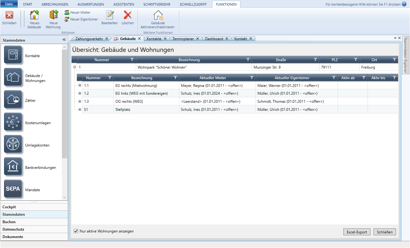 Die Bearbeitung eines Gebäudes erfolgt durch Doppelklick auf die Listenzeile oder alternativ über Funktionen der Ribbonleiste.