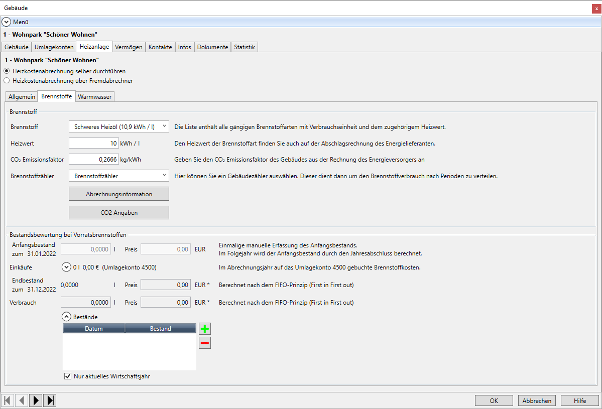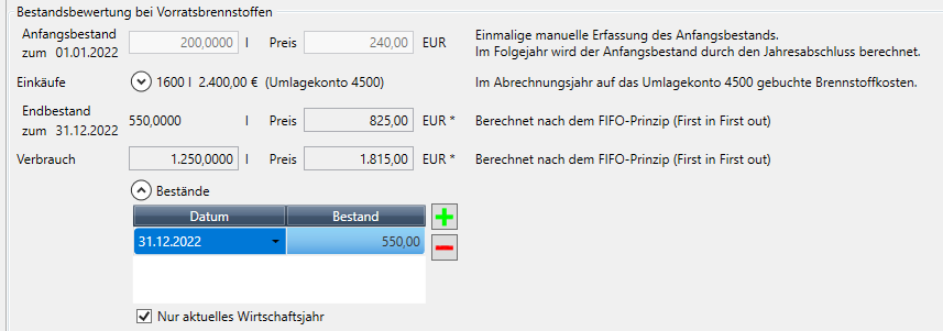 Bei Vorratsbrennstoffen (= Öl, Pellets etc.) müssen die abzurechnenden Anfangs- und Endbestände im Abrechnungsjahr angegeben werden. Es wird in diesem Fall der Bereich Bestandsbewertung bei Vorratsbrennstoffen mit entsprechenden Eingabefeldern eingeblendet (siehe unten).