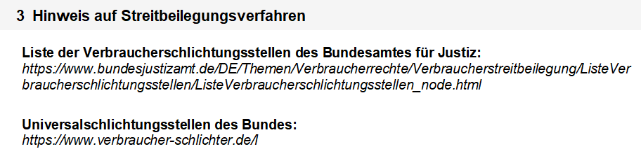 Der Bereich enthält Informationen über die Möglichkeit der Durchführung von Streitbeilegungsverfahren nach dem Verbraucherstreitbeilegungsgesetz