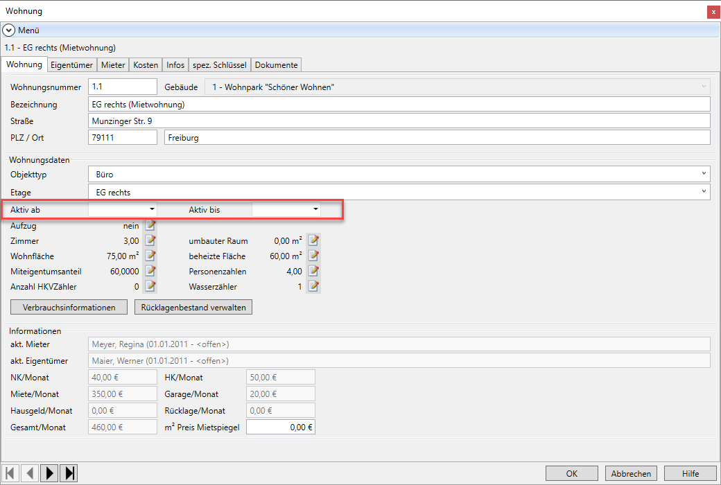 Es besteht die Möglichkeit, über ein Aktiv ab-Datum bzw. ein Aktiv-Bis-Datum Aktivitätszeiträume für Wohnungen zu definieren. Wohnungen werden nur für ihren Aktivitätszeitraum in Abrechnungen berücksichtigt.