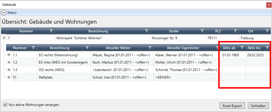 Die Aktivitätszeiträume der Wohnungen werden in der Übersicht: Wohnungen und Gebäude über die Spalten Aktiv ab und Aktiv bis angezeigt. Über das Kontrollkästchen Nur aktive Wohnungen anzeigen können Sie die Liste auf solche Wohnungen einschränken, welche aktuell aktiv sind.