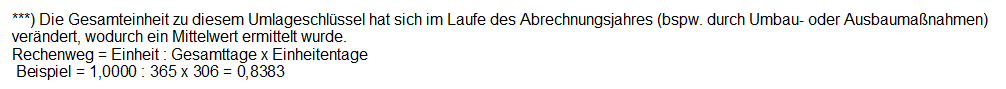 Übrigens: In der Abrechnung werden Umlageschlüssel, bei denen die Gesamteinheit aufgrund von Änderungen über einen Mittelwert ermittelt wurde, entsprechend mit drei Sternchen (***) gekennzeichnet. Die Erläuterung findet sich unterhalb der Kostenauftstellung.