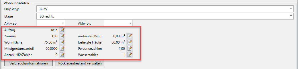 Im Wohnungsfenster werden die aktuell gültigen Wohnungsdaten nur angezeigt. Die Bearbeitung der einzelnen Wohnungsdaten erfolgt über das Symbol rechts neben der jeweiligen Anzeige (siehe unten).