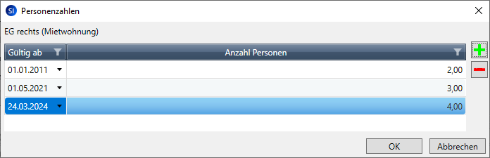 Neue Werte werden über das Plus-Symbol mit ihrem Gültig ab-Datum erfasst und mit OK in das Wohnungsfenster übernommen.