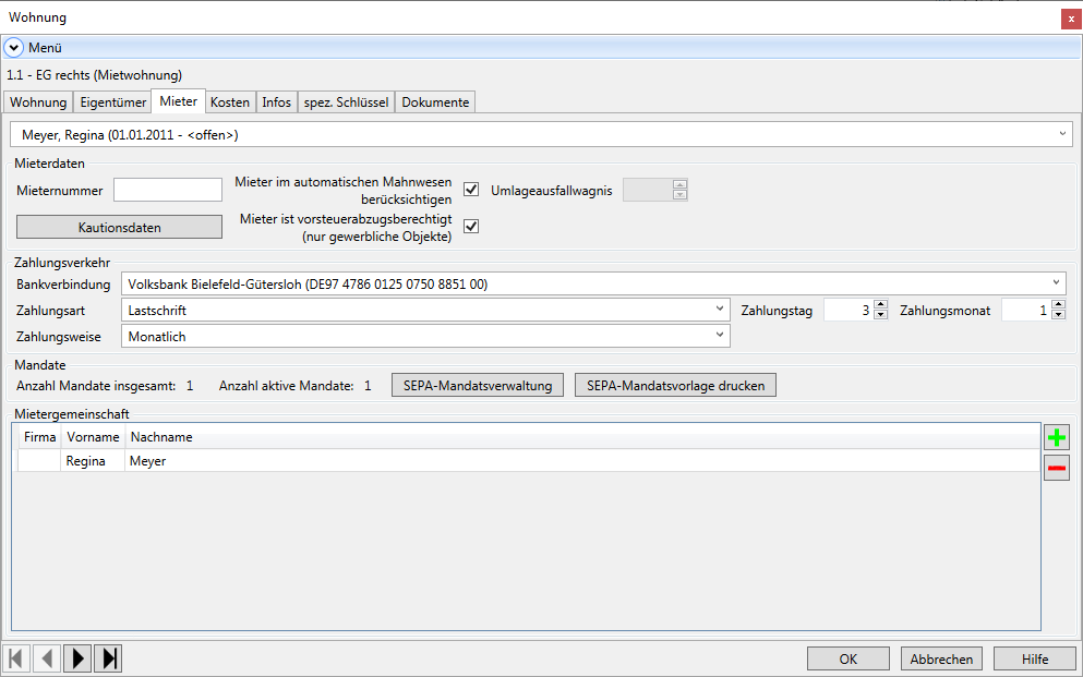 Im Register Mieter des Wohnungs-Dialogfensters können Sie den Wohnungsmieter festlegen und diverse Daten zu diesem Mieter erfassen.