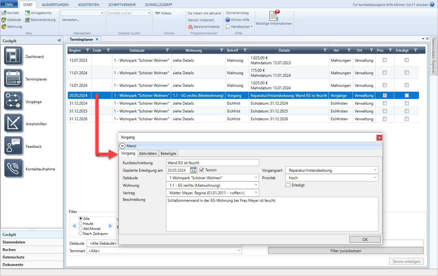 Sie haben damit über den Termin alle vorgangsrelevanten Daten und Angaben einschließlich der Ansprechpartner mit Kommunikationsdaten im Zugriff.