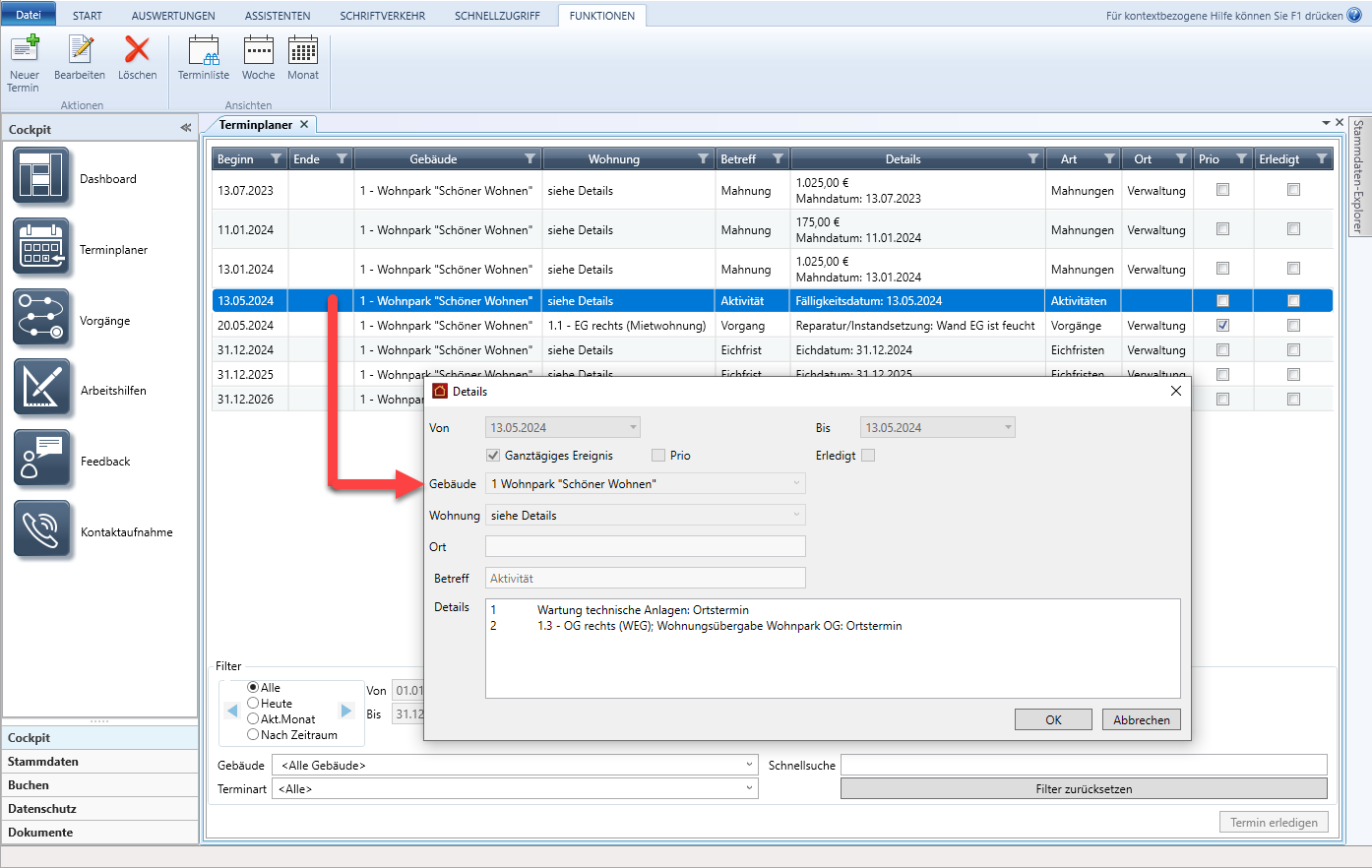 Beim Doppelklick auf einen Sammeltermin von Vorgängen bzw. Aktivitäten öffnet sich das Detailfenster der Terminverwaltung und nicht das Fenster der Vorgangsverwaltung.
