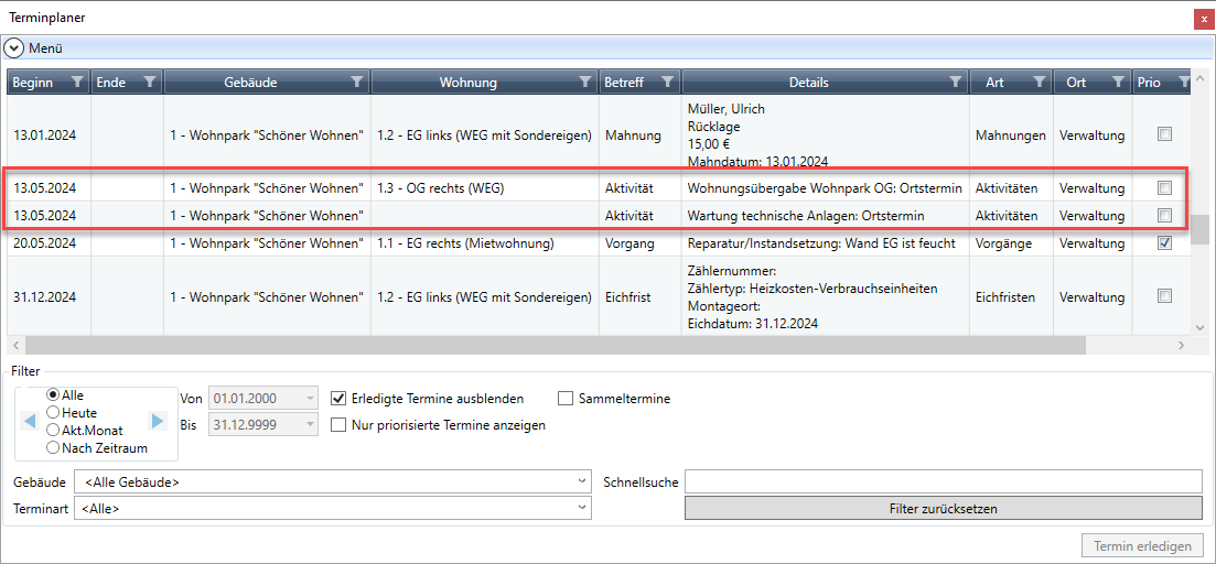 Termine aus der Vorgangsverwaltung besitzen im Terminplaner die Vorgangsart Vorgänge bzw. Aktivitäten. Unter Details wird die Kurzbeschreibung des Vorgangs bzw. der Aktivität ausgewiesen. Termine von Aktivitäten mit der Priorität Hoch besitzen in der Spalte Prio ein Häkchen.