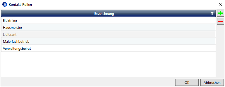 Das Fenster enthält im Auslieferungszustand die programmseitig vorgegebene Rolle Lieferant. Sie können diese Rolle nicht bearbeiten, also nicht umbenennen und auch nicht löschen. Die Rollen 'Eigentümer' und 'Mieter' sind hier nicht sichtbar.
