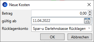 Das Rücklagenkonto ist ein Pflichtfeld. Sie müssen hier eine Eingabe machen. Andernfalls kann das Fenster Neue Kosten nicht gespeichert werden.