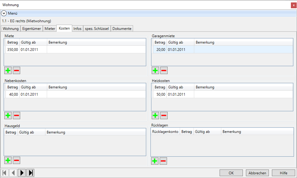 Die Wohnungskosten können Sie im Wohnungs-Dialog im Register Kosten verwalten.