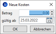 In jedem dieser Bereiche können Sie die angezeigten Beträge und das jeweilige Gültigkeits-Datum direkt in der Tabelle verändern. Außerdem können Sie über die Schaltflächen + und - neue Kostendatensätze erfassen bzw. bestehende Datensätze löschen.