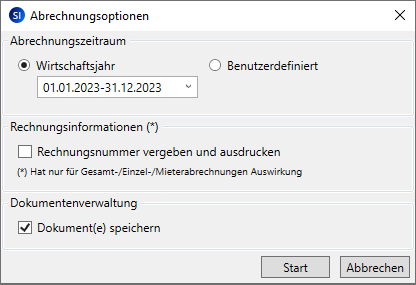 Klicken Sie auf Starte Auswertungen. Das Dialogfenster Abrechnungsoptionen wird geöffnet.