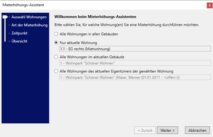 Geben Sie an, ob Sie die Mieter für eine einzelne Wohnung oder für alle Wohnungen eines Gebäudes erhöhen möchten.