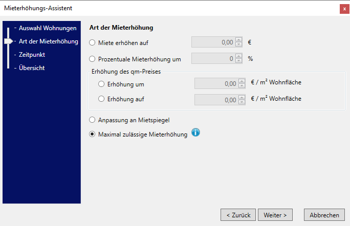 Bestätigen Sie die Auswahl mit Weiter und geben Sie an, wie der neue Mietpreis berechnet werden soll. Mögliche Erhöhungsarten sind unter anderem eine prozentuale Mieterhöhung, eine Erhöhung auf einen bestimmten Quadratmeter-Mietpreis oder auch die maximal zulässige Mieterhöhung nach § 558 BGB. Weitere Informationen erhalten Sie über das Informationssymbol.