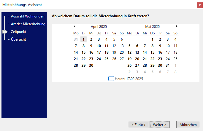 Auf der nächsten Assistentenseite werden Sie nach dem Datum der Mieterhöhung gefragt. Beachten Sie an dieser Stelle, dass eine Mieterhöhung frühestens zu Beginn des dritten Kalendermonats in Kraft treten darf, der dem Zugang des Erhöhungsverlangens folgt. Wenn Sie also am 10. Juni 2017 eine Mieterhöhung mit dem Mieterhöhungs-Assistenten beschließen möchten, so darf diese frühestens am 1. September 2017 in Kraft treten. Falls Sie dagegen am 30. Juni 2017 die gleiche Mieterhöhung beschließen, so darf diese nur dann am 1. September in Kraft treten, wenn Sie das Mieterhöhungsverlangen noch am gleichen Tag schriftlich dem Mieter übergeben. Erhält der Mieter das Schreiben einen Tag zu spät, also bereits im Juli 2017, so gilt die Mieterhöhung erst ab dem 1. Oktober.
