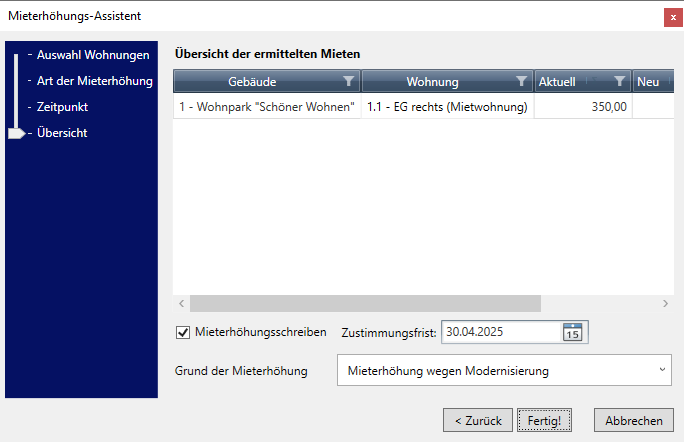 Um Ihnen die Durchführung von Mieterhöhungen trotzdem so einfach wie möglich zu machen, wurde SmartImmo 2026 mit einem "Mieterhöhungs-Assistenten" ausgestattet, der Sie ausführlich durch alle Schritte leitet.