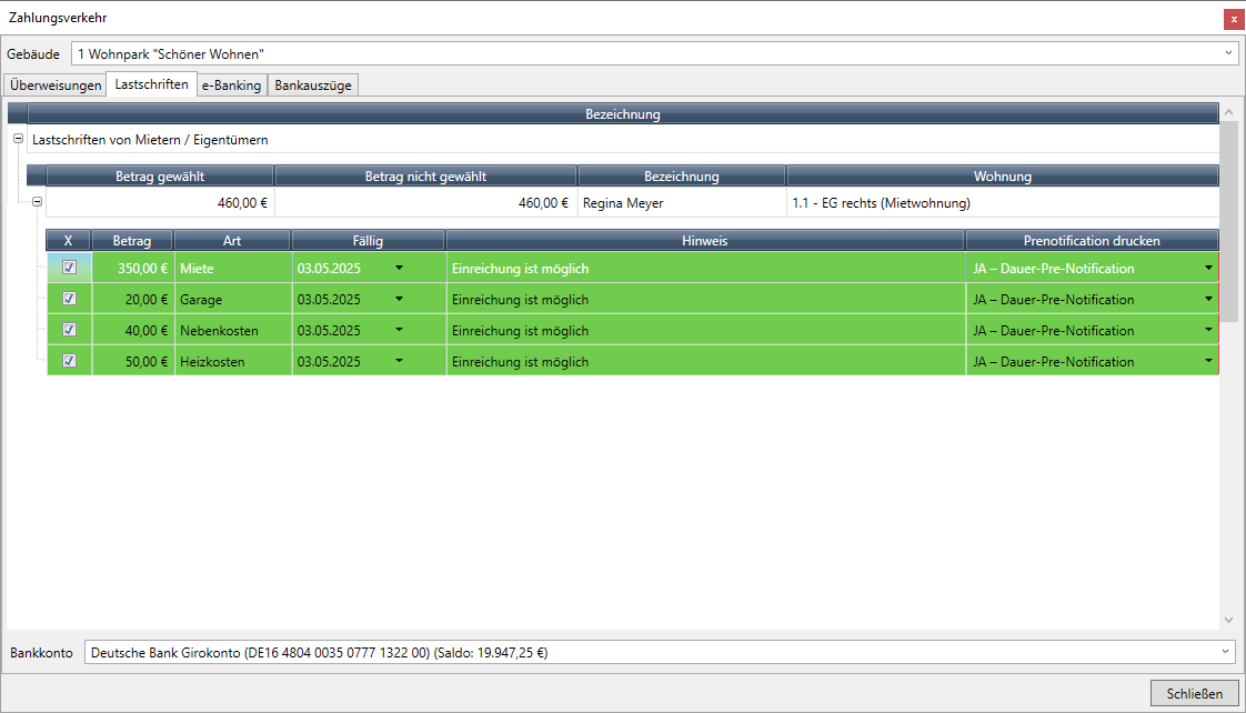Im unteren Fensterbereich wird das Gebäudekonto angezeigt, auf dem die Lastschriften verbucht werden. Es stehen in diesem Feld alle Bankkonten zur Verfügung, die Sie in den Stammdaten unter Bankverbindungen oder im gewählten Gebäude erfasst haben.